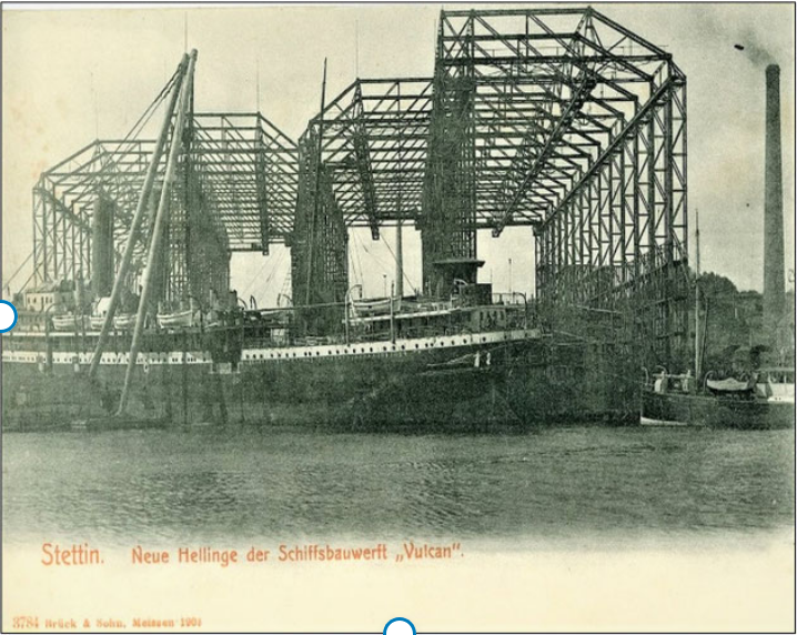Bisher waren deutsche Reedereien auf britische Werften fixiert. Höhepunkte dieser frühen Entwicklung vom Vulcan war die Ablieferung von Kaiser Wilhelm der Große (Abb. 3) an den NDL, die 1897 als erstes deutsches Schiff das Blaue Band für die schnellste Atlantiküberfahrt gewann [2]. Diese Werft war zu dieser Zeit die bedeutendste Schiff- und Maschinenbau-Anstalt im Deutschen Reich. Die Fahrgastschiffe und auch die Marineschiffe hatten 1905 Größen und besonders Tiefgänge erreicht, mit denen sie auch mit Hilfe von „Kamelen“ die untere Oder nicht mehr befahren konnten. Daher wurde in Hamburg ein Zweigbetrieb errichtet, der 1909 den Betrieb aufnahm.