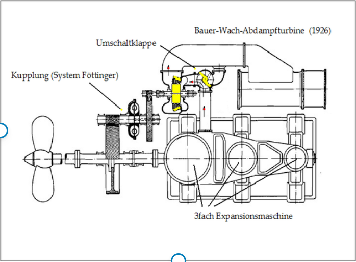 Mit dem Verkauf des Hamburger Vulcans wechselte Bauer zur Deschimag und 1926 entwickelte er mit Hans Wach bei der Werft Joh. C. Tecklenborg in Wesermünde die Bauer-Wach-Abdampfturbine (Abb. 11). Dabei wurde das Prinzip der Vulcan-Kupplung auch bei dieser Kombination von Kolbendampfmaschine, Dampfturbine, hydraulischer Kupplung und Zahnradgetriebe angewendet. Turbinen nach diesem System nutzen die Druckdifferenz aus dem restlichen Dampfdruck des Niederdruckzylinders der Dampfmaschine und dem Unterdruck des Kondensators [6]. Durch dieses Prinzip wird der Wirkungsgrad der Dampfmaschine erheblich verbessert.