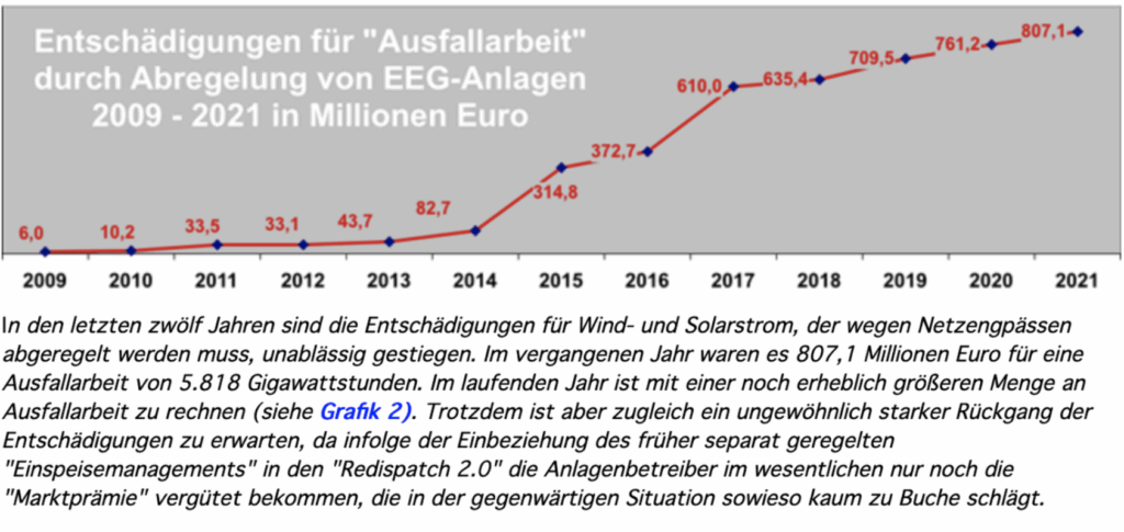 Statt Solar und Windanlagen abzuschalten soll mit diesem Ausfallstrom zukünftig Wasserstoff produziert werden. Im Jahr 2021 wurden mit 800 GWh knapp 3 Prozent der Erneuerbaren Energien abgeregelt, d. h. abgeschaltet (obige Abbildung). Mit rund 59 Prozent der Ausfallarbeit bleibt Windenergie an Land der am meisten abgeregelte Energieträger, gefolgt von Windenergie auf See mit knapp 36 Prozent. Die geschätzten Entschädigungsansprüche der Anlagenbetreiber beliefen sich im Jahr 2021 auf 807,1 Mio. Euro (2020: 761,2 Mio. Euro), das von der Verbrauchern gezahlt wurde.