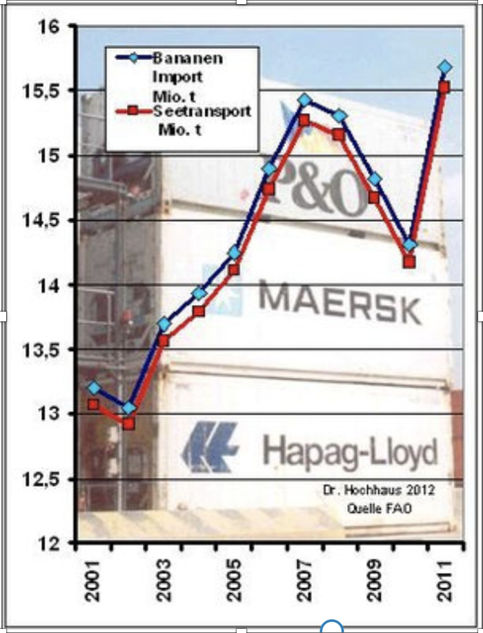 Beim globalen Handel mit Früchten stehen Bananen mit etwa 15,7 Mio. t an 1. Stelle, mit 15,5 Mio. t. spielen Bananen [4, 5] beim seeseitigen Kühlgütertransportes eine wichtige Rolle (Abb. 3). Sie werden über längere Strecken vorwiegend in Kühlschiffen transportiert. Jedoch wurden von Maersk Line mit Verwendung spezieller Kühlcontainer wöchentliche Bananen-Dienste wie z. B. „Ecumed“ oder „Ecubex“ von Ecuador bis ins Schwarze Meer bzw. in die Ostsee (s. a. Abb. 4) eingerichtet. Die wichtigsten Exportländer sind Ekuador, Costa Rica, Philippinen, Kolumbien, Guatemala und Honduras. Davon wurden 2011 wurden weltweit fast 13 Mio. t Zitrusfrüchte (Orangen, Grapefruit, Mandarinen, Limonen) weltweit exportiert, davon 5,5 Mio. t über See. Äpfel, Birnen und Weintrauben werden als Saisonfrüchte bezeichnet, 2011 wurden weltweit 14 Mio. t gehandelt. Der seewärtige Transport betrug fast 8 Mio. t. Der Begriff „exotische Früchte“ umfasst Ananas, Kiwi und Avocado, es wurden 2011 rund 4 Mio. t. grenzüberschreitend gehandelt, 3,3 Mio. t wurden mit Schiffen transportiert.