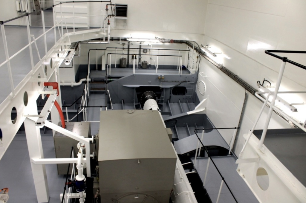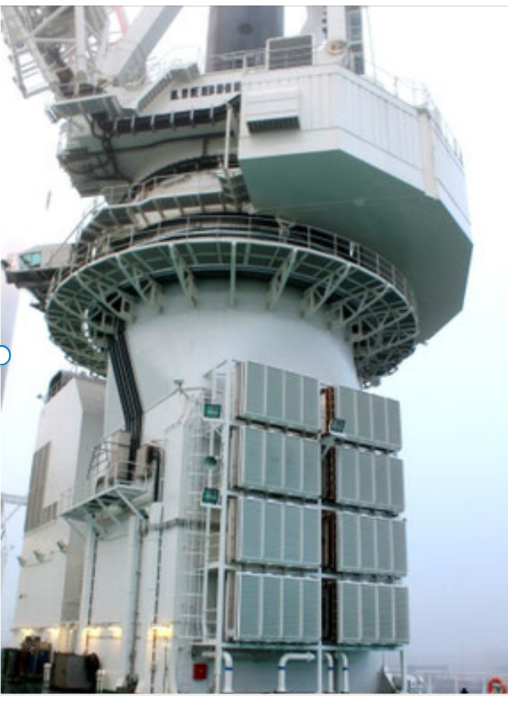 In der Abb. 20 ist das Seewasserrohr mit zwei Zahnstangen und der Grobfiltereinrichtung zu sehen, das auf der Backbordseite hinter dem Deckshaus angeordnet wurde, um die Seewasserversorgung durch das in der Höhe verfahrbare Rohr beim Betrieb als Hubinsel sicherzustellen. Im Saugrohr befinden sich drei Tauchpumpen zur Versorgung des Kühlwasser-, des Feuerlösch- und das Spülsystems. Sollte diese Seewasserversorgung versagen, steht ein Notsystem zur Redundanz auf der Steuerbordseite im hinteren Bereich des Schiffes zur Verfügung.