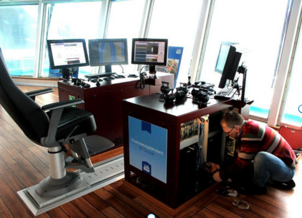 Die nautischen Einrichtungen für den Fahrbetrieb befinden sich im vorderen Bereich der großzügig ausgestatteten, über die gesamte Schiffsbreite angeordneten und rundherum voll verglasten Brücke. Im rückwärtigen Bereich sind separate Fahrstände für die dynamische Positionierung und das Jacken dicht nebeneinander angeordnet. Das von SAM Electronics gelieferte und installierte dynamische Positionierungssystem befindet sich hier im mittleren Fahrpult mit Blick auf das Arbeitsdeck (Abb. 10). Darin ist auch das System zur Satellitennavigation integriert. Vor dem Betriebsübergang vom Schiff zur Hubplattform ist eine exakte Positionierung notwendig, damit sich das Schiff an dem vorgegebenen Ort mit tragfähigem Untergrund aufrichten kann.