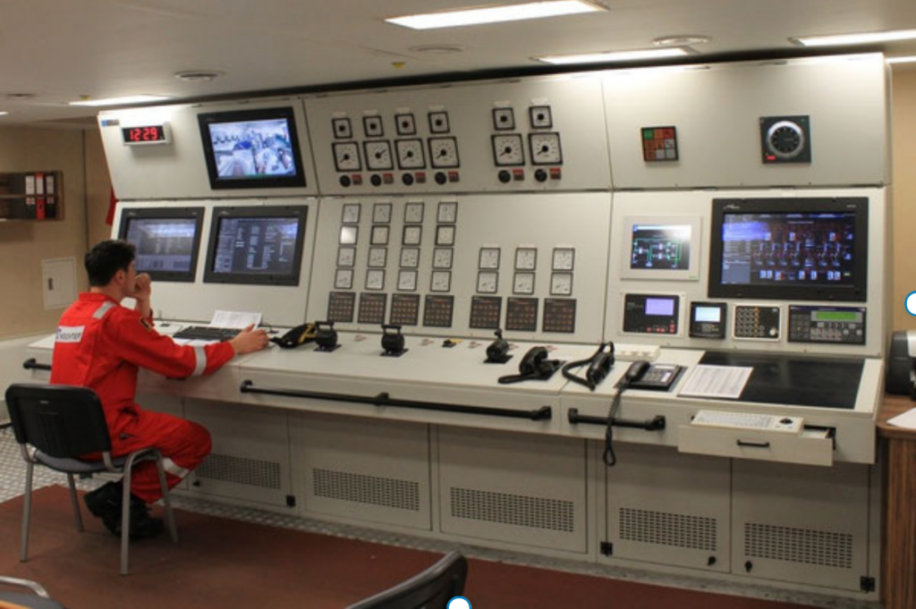 Unter dem Hauptdeck liegen der Maschinenkontrollraum (MKR), die Maschinenräume und die Räume für die Schalttafeln. Der MKR (Abb. 11) enthält das Fahrpult mit dem Automationssystem, die Instrumente mit Anzeigen für die Dieselmotoren und die Hilfssysteme. Aufgrund der Redundanz befinden sich die elektrischen Schalttafeln und Transformatoren in zwei separaten Räumen. Auch die Dieselgeneratoren wurden aus dem gleichen Grund in getrennten Räumen angeordnet.