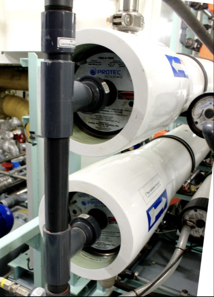Die Trinkwasseranlage besteht aus der Umkehrosmoseanlage zur Entsalzung des Meerwassers (Nennleistung 30 cbm/Tag, Nenndruck 70 bar, Nennleistung 11 kW), der Trinkwasseraufbereitung und den Drucktanks. Die Speisepumpe fördert das Seewasser durch den Vorfilter (>25 Mikrometer) und den Kerzenfilter (>5 Mikrometer). Das gereinigte Wasser wird von der Hochdruckpumpe anschließend durch die Umkehrosmose-Membranelementen (Abb. 15) gedrückt, aus denen das als Permeat bezeichnete Reinwasser strömt. Aus der nachgeschalteten Trinkwasseraufbereitungsanlage fließt es in die Vorratstanks.