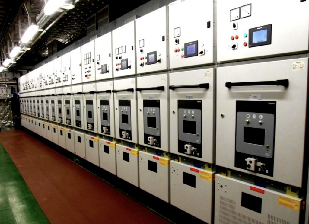 Diese vier Generatoren erzeugen elektrischen Strom mit einer Spannung von 6.600 V und einer Frequenz von 60 Hz. Er fließt zu der Mittelspannungs-Schalttafel in zwei redundanten E-Zentralen und wird hier auf die verschiedenen Mittelspannungs-Verbraucher verteilt. Über Transformatoren wird der Strom in die Spannungsebenen 690 und 440 Volt gewandelt, um die Dreh- und Wechselstromverbraucher der verschiedenen Systeme, die Hotellast, die Brückenverbraucher und Beleuchtung zu versorgen.