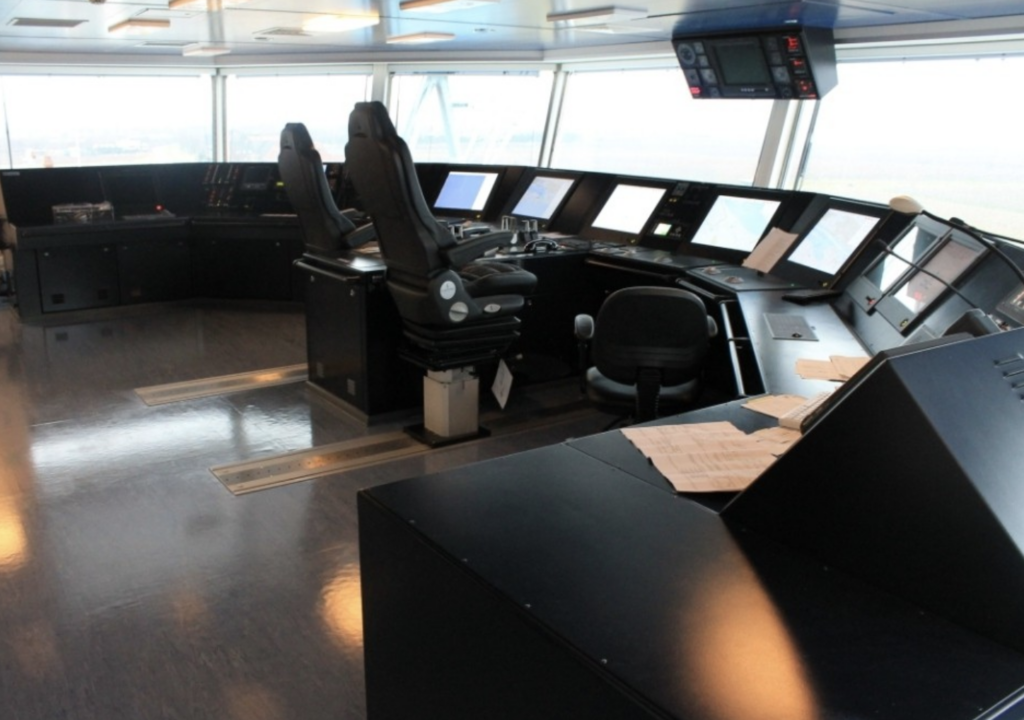 Auf der kompakten Brücke befinden sich die nautischen und technischen Einrichtungen für den Fahr- und Hubbetrieb. Im vorderen Teil sind die Brückenpulte für den normalen Fahrbetrieb angeordnet (Abb. 17). Im hinteren Teil – mit Blick auf das Arbeitsdeck – befinden sich die Einrichtungen für das dynamische Positionieren, das Aufrichten und den Betrieb als Hubinsel.