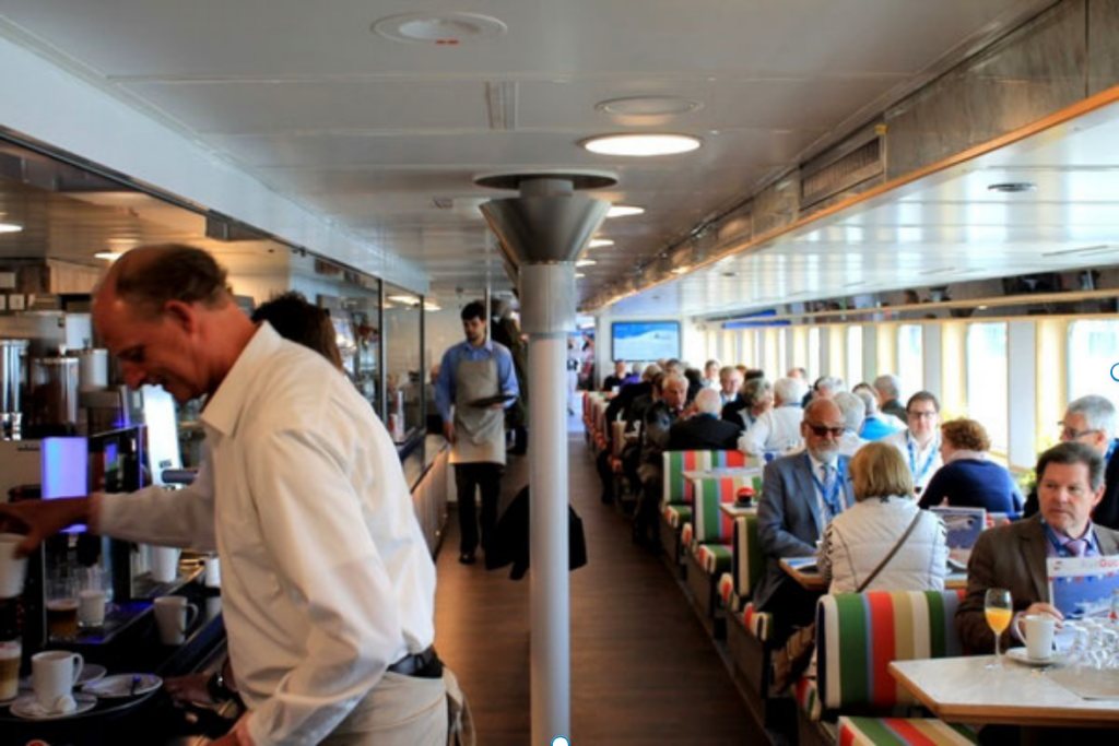 Dabei hatten die Gäste die Möglichkeiten, die modernisierte Brücke (Abb. 4) und die erneuerten Passagier- und Bewirtschaftungseinrichtungen zu erleben. Aus dem 30 Jahre alten Schiff ist ein zeitgemäßes Fährschiff mit heutiger Infrastruktur und W-Lan in allen Räumen und Decksbereichen entstanden. Die Reederei rechnet bei den Betriebskosten mit einer Einsparung von 20 – 25%.