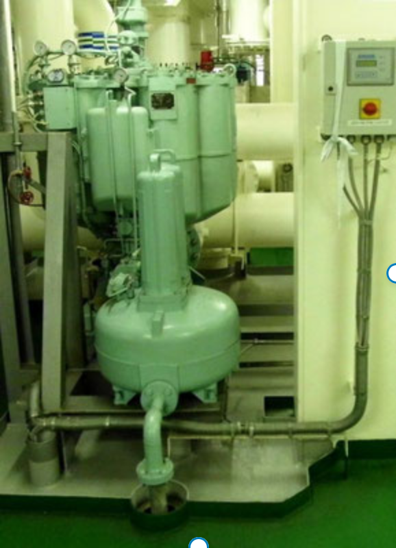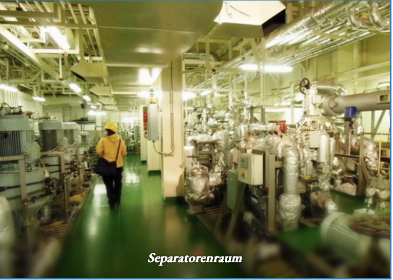 Als Kraftstoffe der Haupt- und Hilfsdieselmotoren wird seit ca. 1960 das vorher vorwiegend in Kesseln von Turbinenschiffen verfeuerte zähflüssige Schweröl genutzt. Das war der Anfang vom Ende der Dampfturbinenschiffe, da Dieselmotoren einen im Vergleich zum Dampfantrieb höheren Wirkungsgrad aufweisen. Der große Preisunterschied zwischen dem Schweröl und Dieselöl rechtfertigte den technischen Aufwand für die zum Schwerölbetrieb notwendigen zusätzlichen Systeme zur Kraftstoffreinigung und Vorwärmung auf 120 – 130 °C [7, 8]. Erst bei der Begehung der auf Dieselmotorschiffen eingesetzten Anlagen zur Schwerölaufbereitung (Abb. 5) mit ihren zahlreichen Filtern, Separatoren und Vorwärmern wird die Komplexität dieser Systeme deutlich.