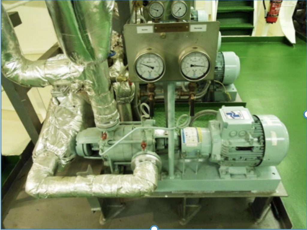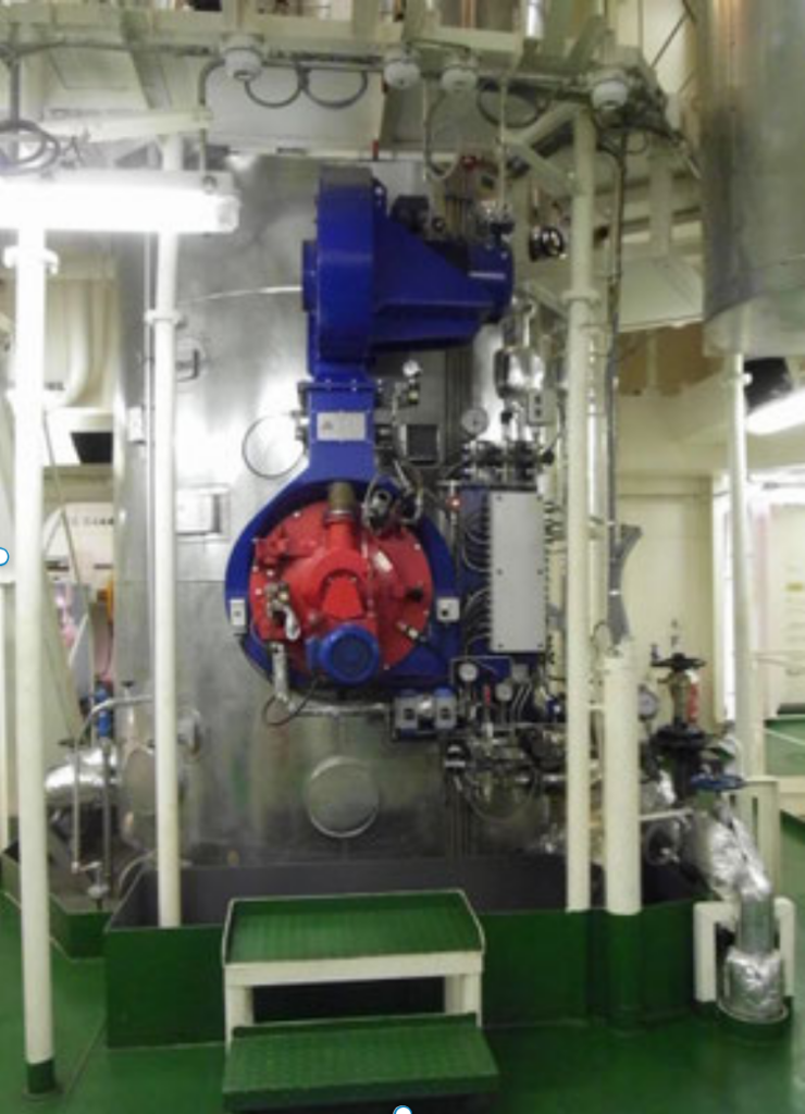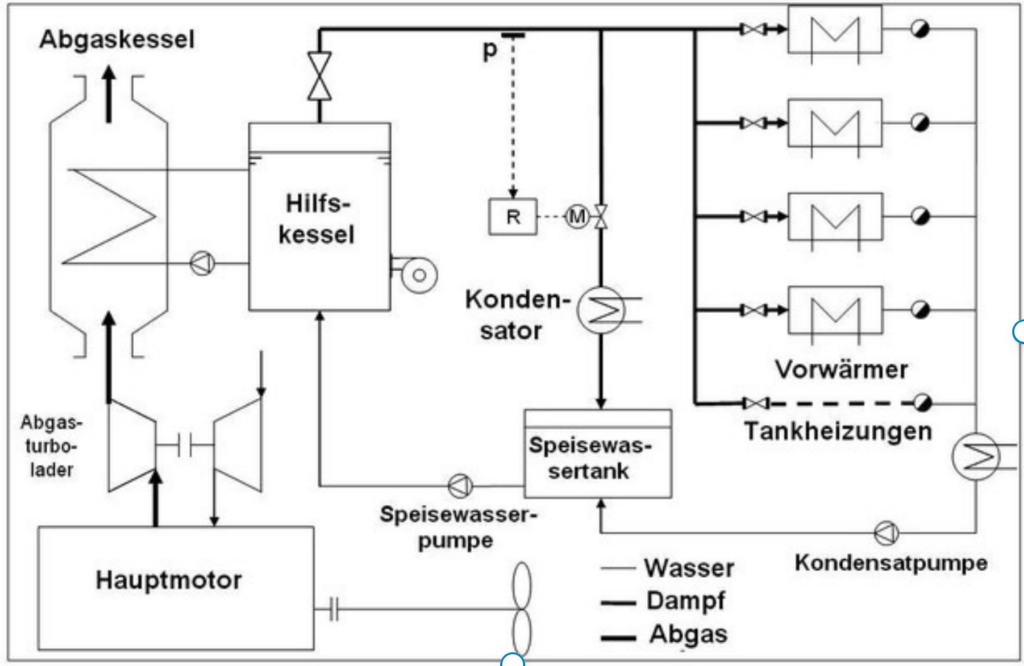 Auf Schiffen erfolgt eine Abgasnutzung durch ein Dampf- oder seltener durch ein Thermoölsystem. Der an Bord von Motorschiffen benötigte Sattdampf dient als Heizmedium zur Vorwärmung und Aufbereitung des Schweröls. Dieser Sattdampf wird im Seebetrieb im Abgaskessel gewonnen, welcher dem Hauptmotor (seltener den Hilfsdieseln) nachgeschaltet ist (Abb. 10). Im Hafenbetrieb wird der Dampf im Hilfskessel (Abb. 11) erzeugt. Außerdem gehört zum Dampfsystem ein Speisewasserbehälter (Abb. 12) und Speisewasserpumpe (Abb. 13) , die den Kessel mit Wasser versorgen. Auf einigen Schiffen mit größeren Motorleistungen wird der Sattdampf im Abgaskessel überhitzt und in einem Dampfturbogenerator zur elektrischen Stromerzeugung genutzt. Diese Anlagen werden häufig mit einem Abgasturbogenerator kombiniert und u. a. von MAN, Siemens und Mitsubishi angeboten [13]. Sie wurden bisher jedoch nur von wenigen Reedereien wie z. B. Maersk eingesetzt.